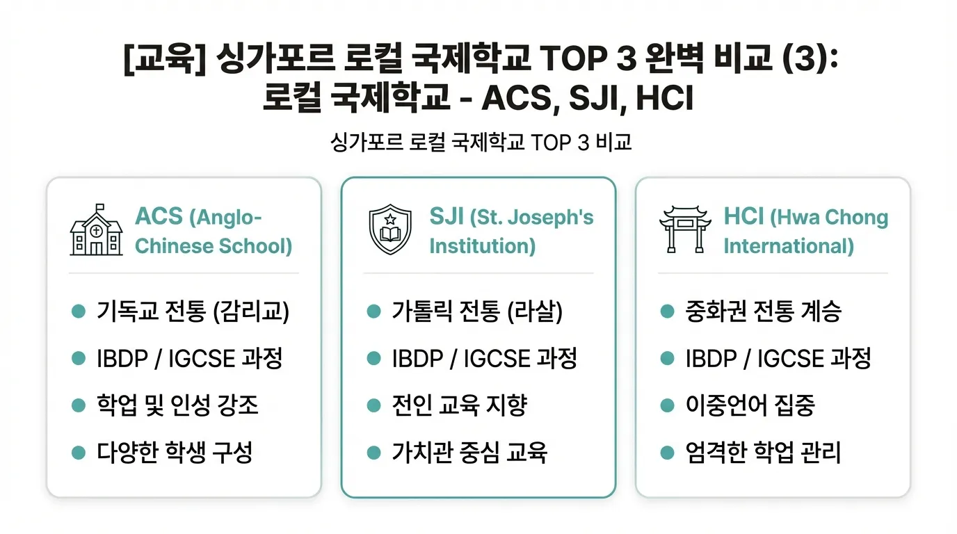 싱가포르에 처음 거주하게 되면 아이 학교 문제로 밤잠 설치는 분들 정말 많으시죠? SAS나 UWC 같은 유명 외국인 국제학교도 좋지만, 요즘은 '로컬 국제학교'라고 불리는 ACS, SJI, HCI에 대한 관심이 뜨거워요. 싱가포르 공교육의 탄탄한 커리큘럼과 국제학교의 자율성이 합쳐진 형태라 한국 부모님들 사이에서도 인기가 대단하거든요. 오늘은 이 세 학교를 꼼꼼하게 비교해 드릴게요.