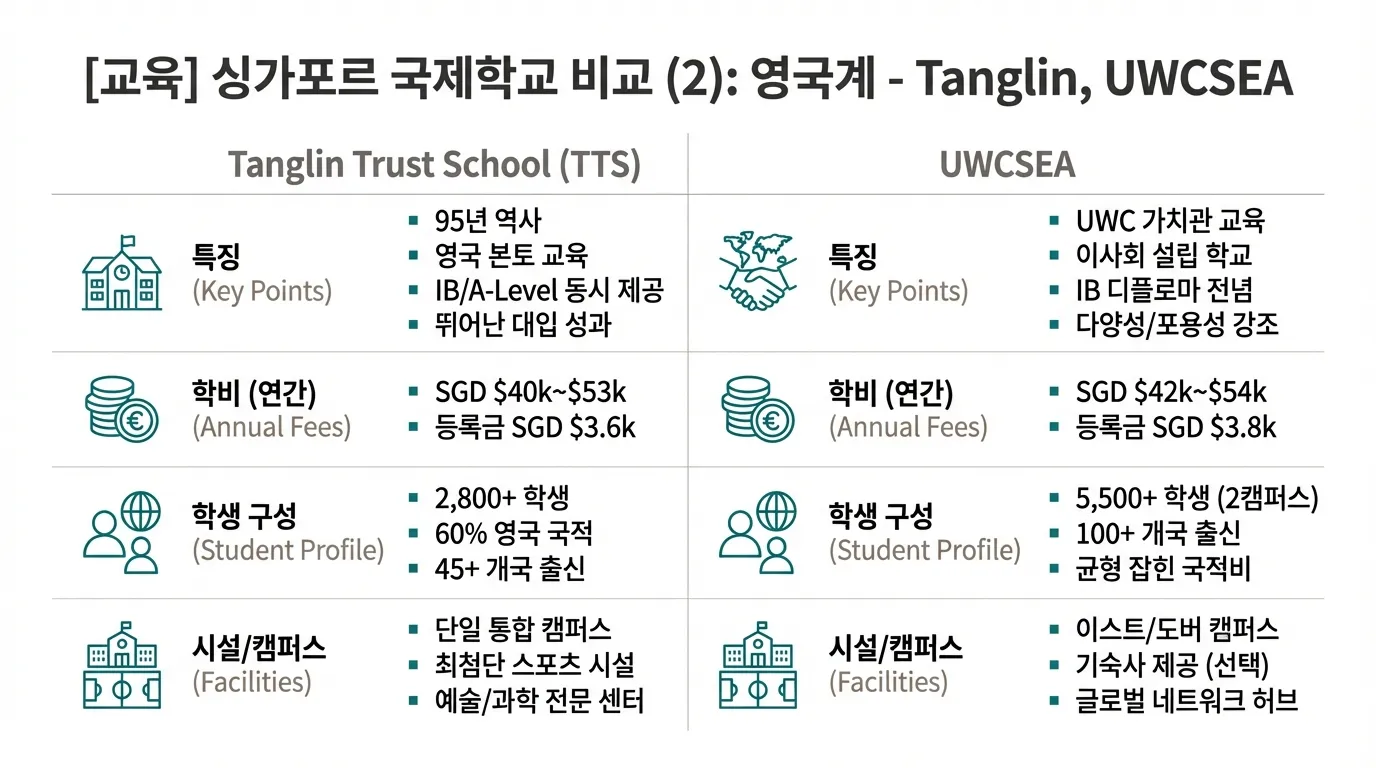 - 커리큘럼 차이: TTS는 A-Level과 IB 중 선택 가능, UWCSEA는 전 과정 IB 중심
