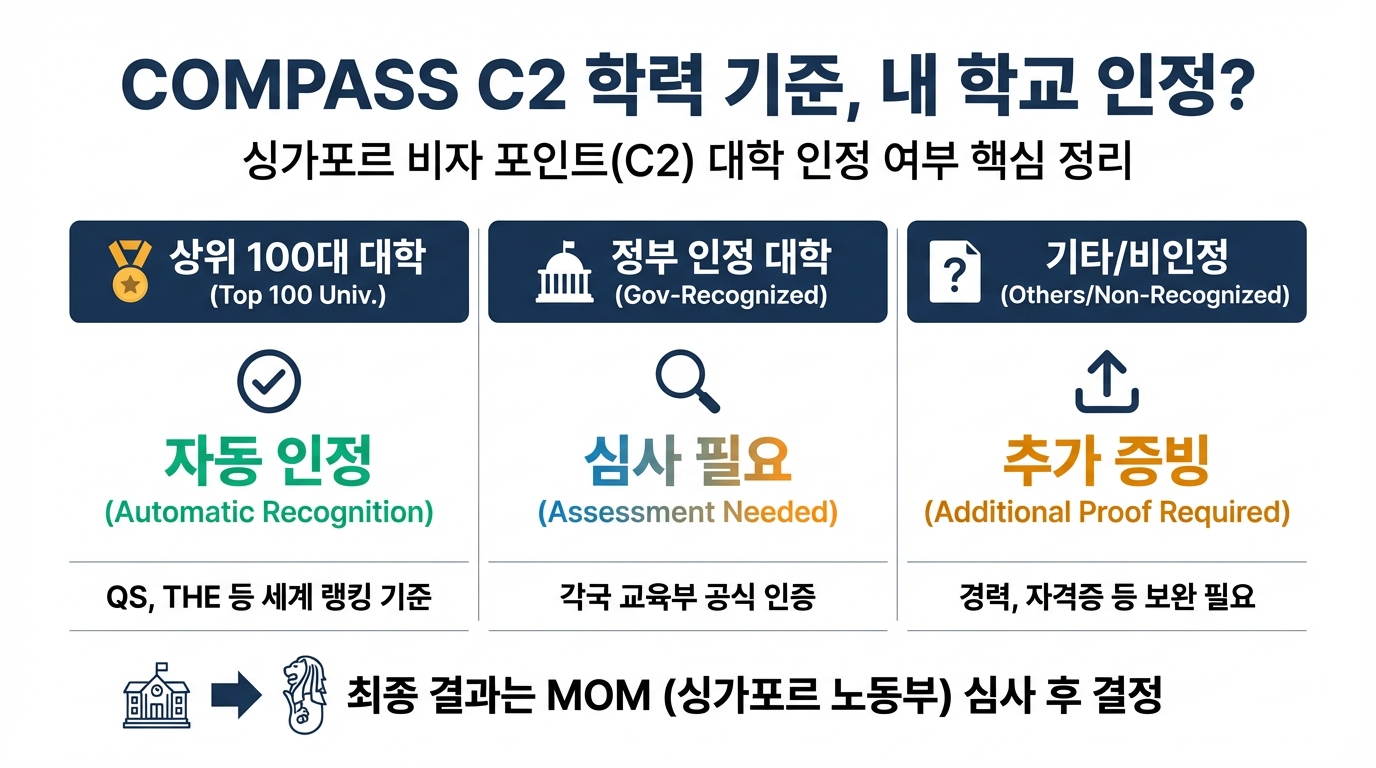 단순히 '좋은 대학'의 기준이 아니라, 싱가포르 정부가 점수를 주는 기준은 꽤 명확합니다. 오늘은 한국인 지원자들이 가장 궁금해하는 C2 학력 항목을 파헤쳐 볼게요.