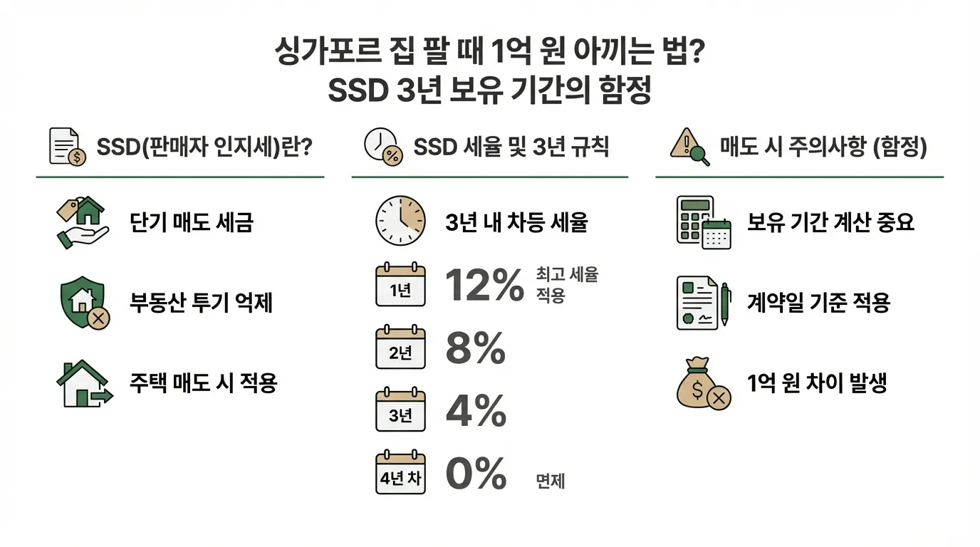 이때 아무 생각 없이 매도 계약서에 사인했다가는 수천만 원에서 억 단위의 '세금 폭탄'을 맞을 수 있어요. 바로 싱가포르 정부가 부동산 투기를 막기 위해 도입한 SSD(Seller’s Stamp Duty, 판매자 인지세) 때문인데요. 오늘은 싱가포르 거주자라면 반드시 알아야 할 SSD의 모든 것을 아주 쉽게 풀어드릴게요.