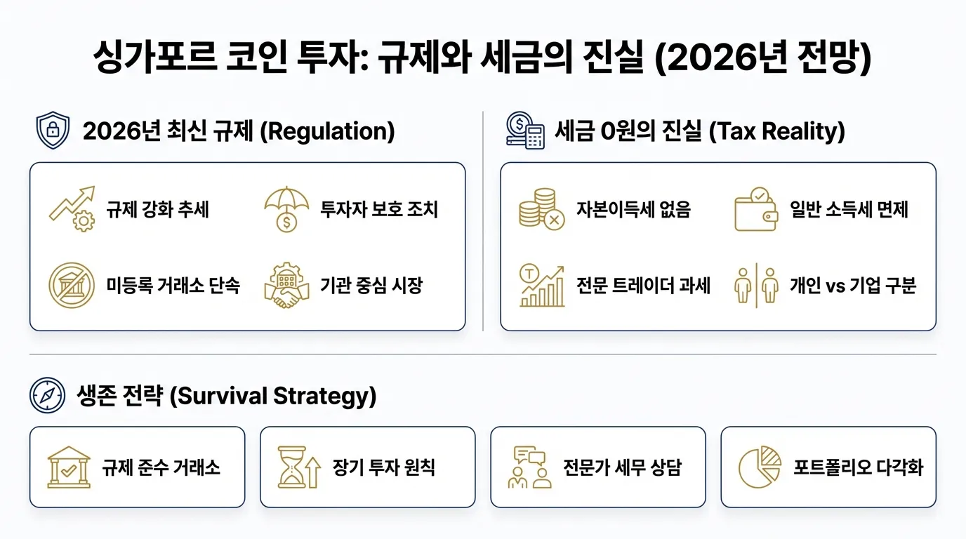 싱가포르 코인 투자, 세금 0원의 진실? 2026년 최신 규제와 생존 전략 인포그래픽