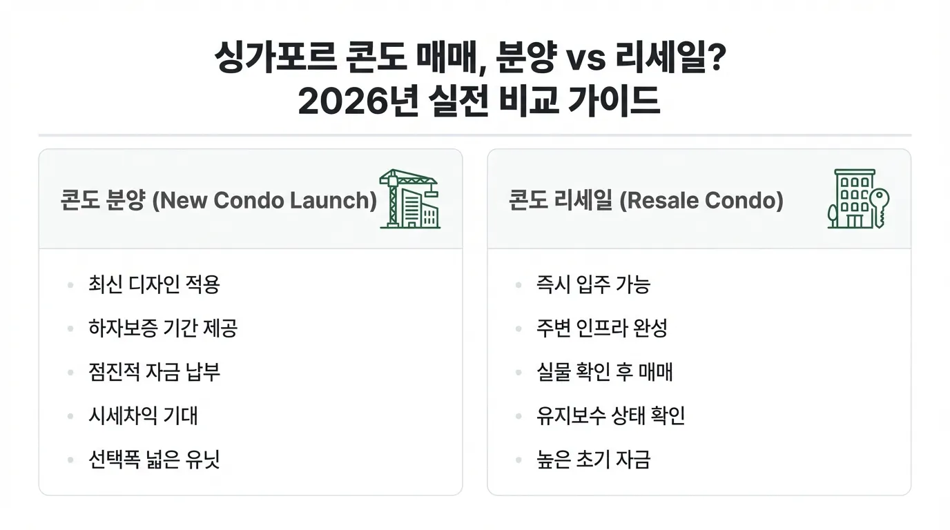 - 신규 분양(New Launch): 중도금 순차 납부(PPS)로 초기 부담이 적고 1년 하자 보수가 보장되지만, 3 ~ 4년의 입주 대기 기간이 필요해요.