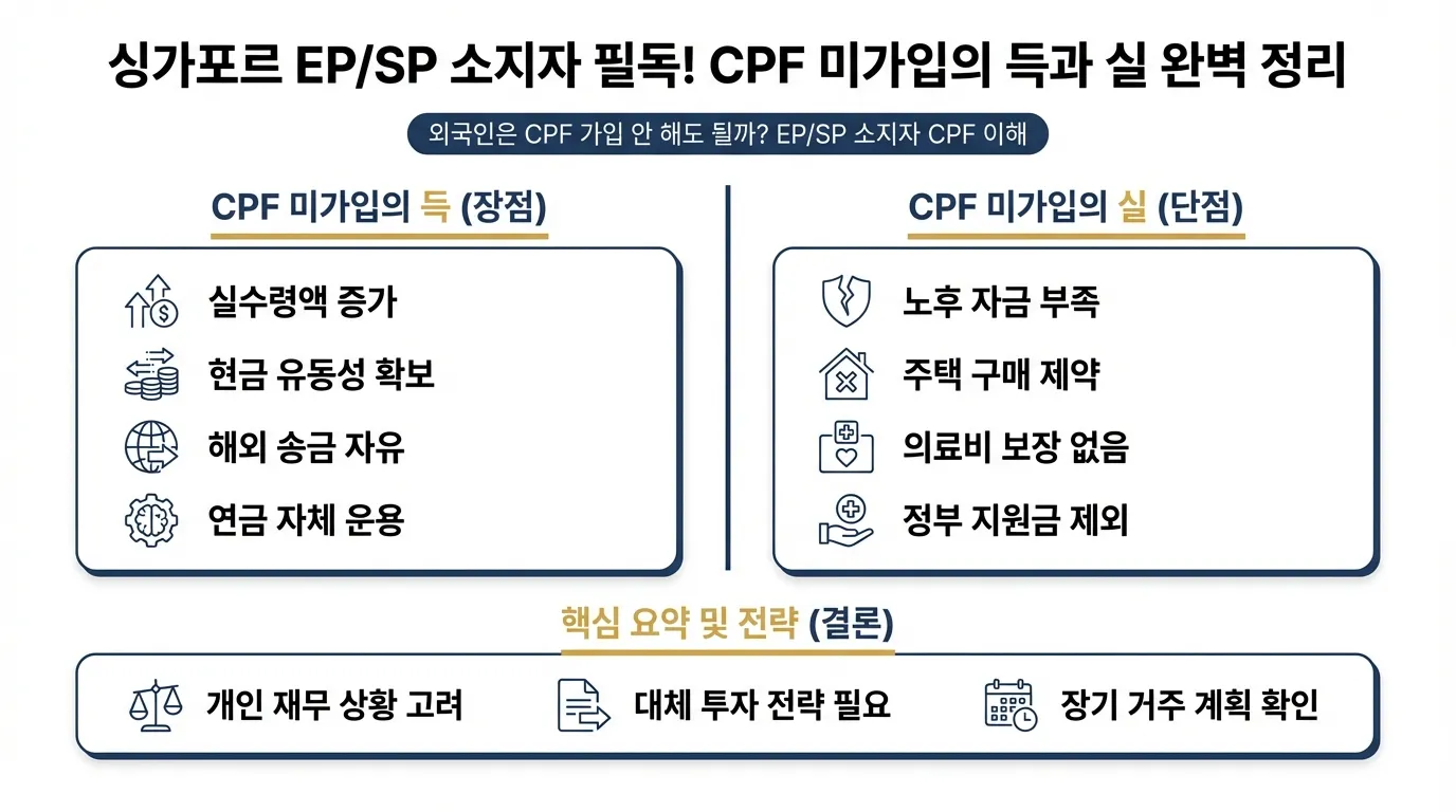 - EP/SP 소지자는 CPF 의무 가입 대상이 아니며, 고용주 부담금(17%)도 없습니다.