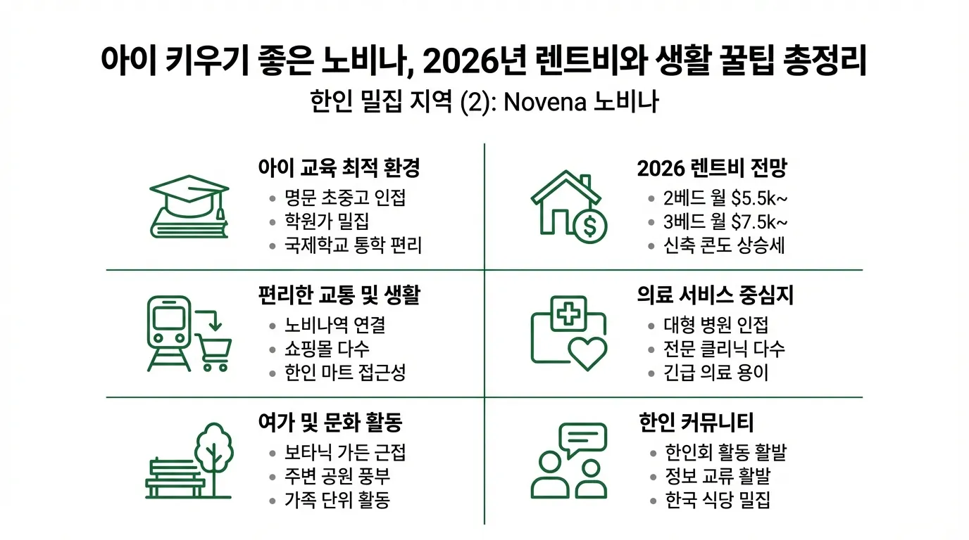 아이 키우기 좋은 노비나, 2026년 렌트비와 생활 꿀팁 총정리 인포그래픽