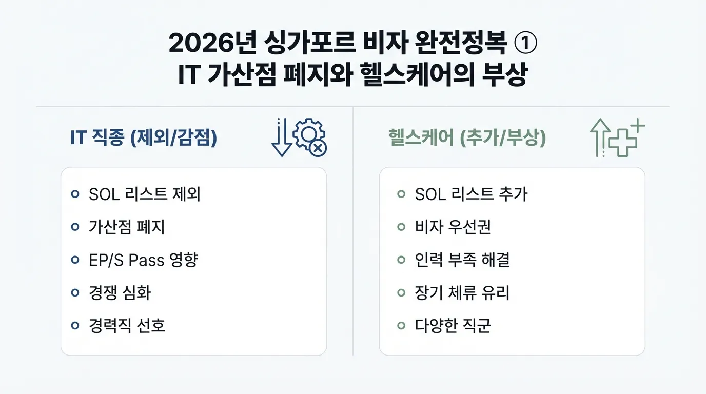 최근 싱가포르 노동부(MOM)에서 2026년부터 적용될 새로운 부족직종(SOL) 리스트를 발표했습니다. 이번 발표의 핵심은 그동안 '치트키'처럼 통했던 IT 직종의 가산점이 대거 사라지고, 대신 헬스케어 분야가 그 자리를 채웠다는 점이에요. 우리 가족의 싱가포르 생활을 좌우할 비자 정보, 지금부터 꼼꼼하게 짚어드릴게요.